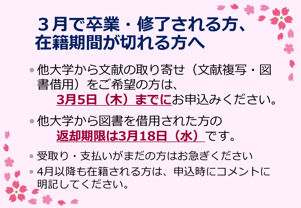 ・他大学から文献の取り寄せ(文献複写・図書借用)をご希望の方は、3月5日(木)までにお申込みください。