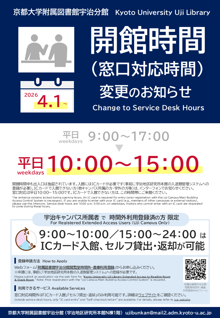 - 【宇治分館】開館時間(窓口対応時間)変更のお知らせ(2026/4/1から 10:00~15:00) (2026-03-10)