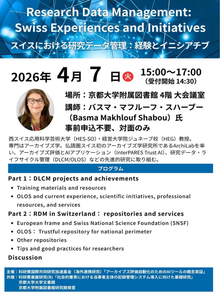 【附属図書館:お知らせ】附属図書館研究開発室セミナー「スイスにおける研究データ保存管理:経験とイニシアチブ」を開催します(4/7)